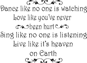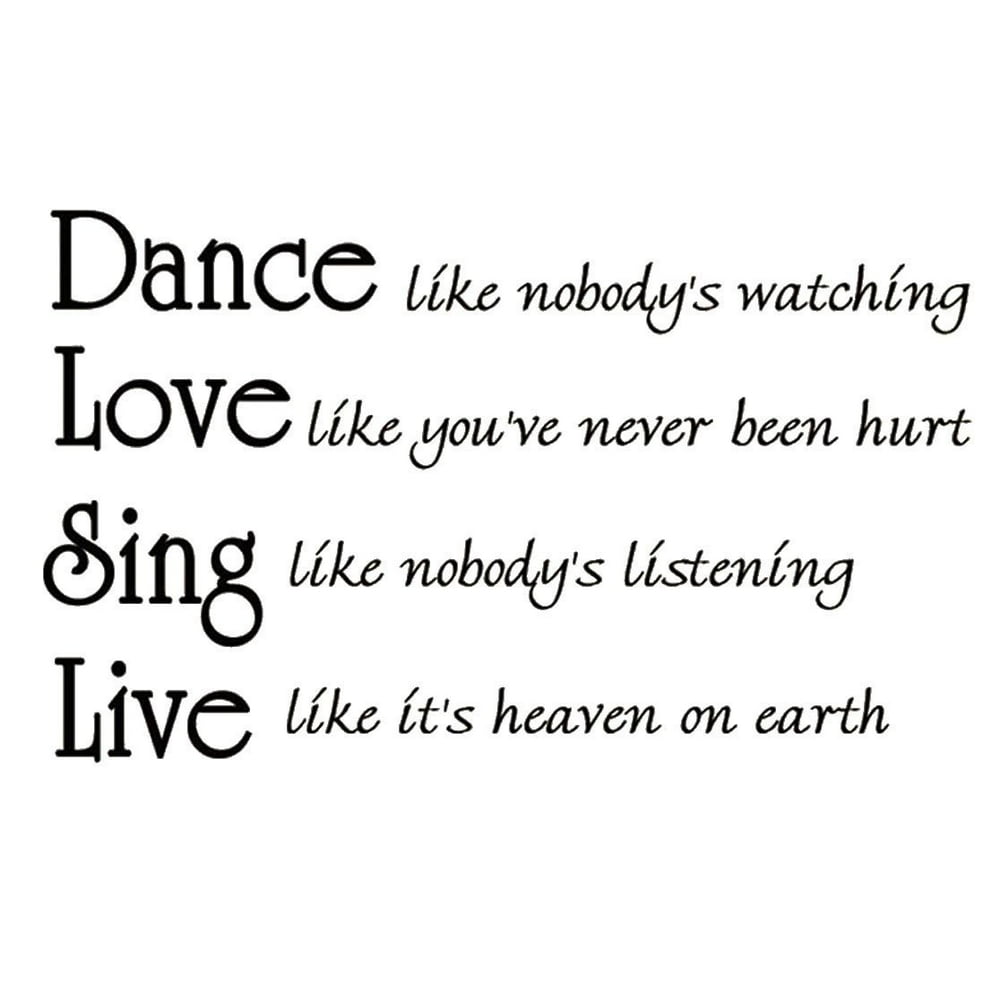17/08/2015 · Dance like nobody’s watching.-Satchel Paige “ Life is sweet when you pay attention. When it doesn’t seem sweet, put a sticker on your nose and do a funky dance.-Whitney Scott “ The dance is over, the applause subsided, but the joy and feeling will stay with you forever.-W.M. Tory “ People come to see beauty, and I dance to give it to them.-Judith …See more ideas about dance, tap dance, dance life. Dec 27, 2021 - Explore Dance Trance Rome's board "Dance Like Nobody's Watching", followed by 131 people on Pinterest. PrivacyQuotes from inspirational People. Ways to inspire people. more... "Dance like nobody's watching; love like you've never been hurt. Sing like nobody's listening; live like it's heaven on earth." -Mark Twain.Product Description. Shipping & Returns. Customer Reviews. Dance Like Nobody's Watching Inspirational Decal measures 20"W X 15" H and is made with top quality vinyl and gives the appearance of a professionally hand painted stencil look without the mess and hassle. Makes a great addition to any room in the home or office.Dance Like Nobody's Watching; You've gotta dance like there's nobody watching, Love like you'll never be hurt, Sing like there's nobody listening, And live like it's heaven on earth. William W. Purkey Inspirational Quotes; Dance as if you are alone, and no one will ever see, As this is your chance, to see what you could be.Satchel Paige's Quote: Work like you don't need the money. Love like you've never been hurt. Dance like nobody's watching.Motivational print, inspirational quote Dance Like Nobodys Watching, Love Like Youve Never Been Hurt. Sing Like Nobodys Listening; Live Like Its Heaven On Earth INSTANT DOWNLOAD *** PLEASE NOTE *** You are purchasing a digital file only.Free and Funny Affirmations Ecard: Dance like nobody attractive is watching. Create and send your own custom Affirmations ecard.Dance like nobody's watching, Love like you've never been hurt, and Live like there's no tomorrow! This wall decal is our own take on this inspirational saying that reminds you to make the most of today! Dimensions: Large (shown) - 44 inches wide by 29 inches high; Medium - 33.5 inches wide by 22 inches high; Small - 22 inches wide by 14.5 inches high