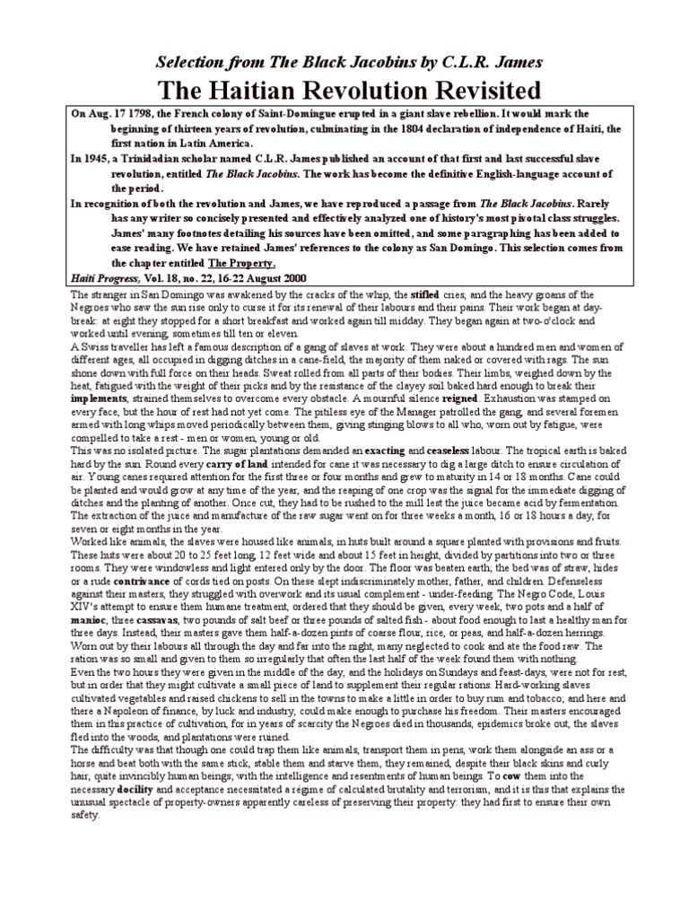 The Black Jacobins Quotes Showing 1-26 of 26 “When history is written as it ought to be written, it is the moderation and long patience of the …The Black Jacobins Important Quotes 1. “The difficulty was that though one could trap them like animals, transport them in pens, work them alongside an ass or a horse and beat both with the same stick, stable them and starve them, they remained, despite their black skins and curly hair, quite invincibly human beings; with the intelligence and resentments of human beings.C. L. R. James. Source. Report... The race question is subsidiary to the class question in politics, and to think of imperialism in terms of race is disastrous. But to neglect the racial factor as merely incidental is an error only less grave than to make it fundamental. C. L. R. James.Men make their own history, and the black Jacobins of San Domingo were to make history which would alter the fate of millions of men and shift the economic currents of three continents.” -- CLR James (Chapter I)Two of the best book quotes from The Black Jacobins: Toussaint L'Ouverture and the San Domingo RevolutionFeb 4, 2016 - 26 quotes from The Black Jacobins: Toussaint L'Ouverture and the San Domingo Revolution: ‘When history is written as it ought to be written, it is the mo... Pinterest. Today. Explore. When autocomplete results are available use up and down arrows to review and enter to select. Touch device users, explore by touch or with swipe ...Quotes from The Black Jacobin... “When history is written as it ought to be written, it is the moderation and long patience of the masses at which men …Online University of the Left20/05/2019 · For the short assignment. a) Place the quote above in the context of Du Bois’s article. Proceed to reflect on the argument he is making in the article, in relation to how the first chapter of CLR James’ The Black Jacobins presents the slaves at the centre of this world historical moment.